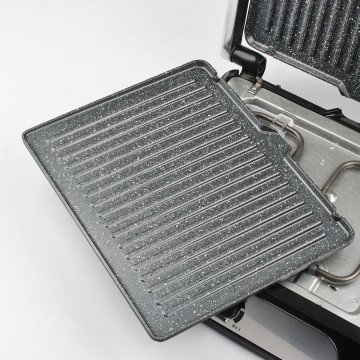 Compatta e dal corpo realizzato in acciaio inox, la bistecchiera BS41 offre diverse funzionalità: può essere infatti utilizzata come una tradizionale griglia a contatto, come tostiera per preparare gustosi sandwich, come mezza griglia / mezza piastra oppure completamente aperta a libro per grigliare pesce o carne raddoppiando la superficie di cottura. Dispone di un ampio manico antiscottatura e sulla base è installata la manopola di regolazione della temperatura e le spie di accensione e “pronto calore”. Il piano cottura è dotato di due ampie piastre antiaderenti removibili con speciale rivestimento “Petravera”: questo innovativo rivestimento antiaderente ad effetto pietra consente una cottura più sana, naturale e senza grassi.