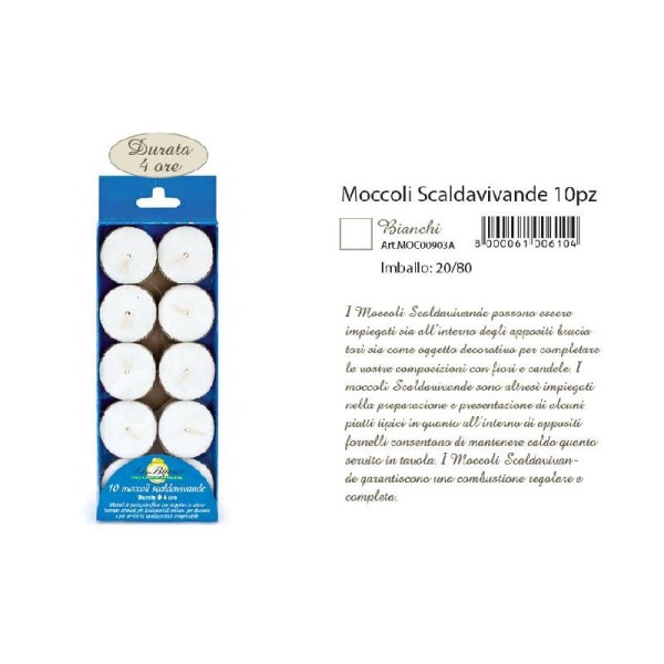 Moccoli scaldavivande in contenitore di alluminio. Confezione da 10 pz. Durata circa 4 ore. Combustione regolare e completa. Bianchi, senza profumo.
