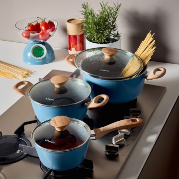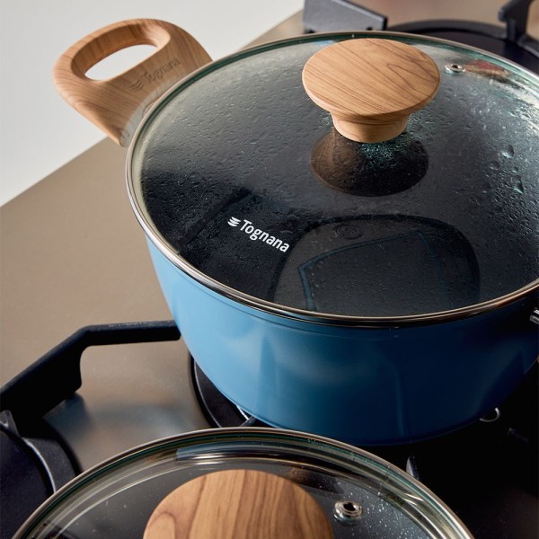 La casseruola 2 manici da 24 cm Skyline fa parte del caratteristico set del marchio Tognana che unisce funzionalità ed estetica grazie al suo design di colorazione azzurra, ideale da abbinare ai piccoli elettrodomestici Iridea carta da zucchero. La casseruola 24 cm Skyline ha il corpo in alluminio forgiato e il rivestimento interno effetto pietra rinforzato a 4 strati che garantisce un'ottima antiaderenza e una distribuzione uniforme del calore; il fondo ad alto spessore la rende adatta a tutti i piani di cottura, compresa l'induzione; il rivestimento esterno di alta qualità permette una forte resistenza ad alte temperature. I manici con finitura soft touch effetto legno sono antiscivolo ed antiscottatura. Nickel free e PFOA free, la casseruola a 2 manici da 24 cm è idonea al lavaggio in lavastoviglie.