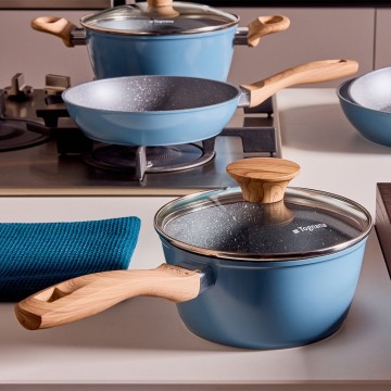 La casseruola ad 1 manico da 16 cm cm Skyline fa parte del caratteristico set del marchio Tognana che unisce funzionalità ed estetica grazie al suo design di colorazione azzurra, ideale da abbinare ai piccoli elettrodomestici Iridea carta da zucchero. La casseruola 16 cm Skyline ha un corpo in alluminio forgiato e un rivestimento interno effetto pietra rinforzato a 4 strati, che garantisce un'ottima antiaderenza e una distribuzione uniforme del calore; il fondo ad alto spessore la rende adatta a tutti i piani di cottura, compresa l'induzione; il rivestimento esterno di alta qualità permette una forte resistenza ad alte temperature. Il manico con finitura soft touch effetto legno è antiscivolo ed antiscottatura. Nickel free e PFOA free, la casseruola Skyline è idonea al lavaggio in lavastoviglie.