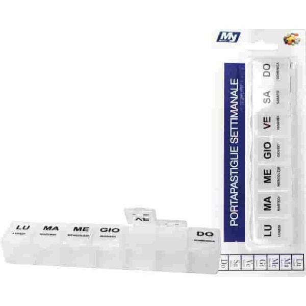 Portapastiglie settimanale rettangolare. Sette scomparti con pratica chiusura per dividere le pastiglie da prendere durante la settimana.